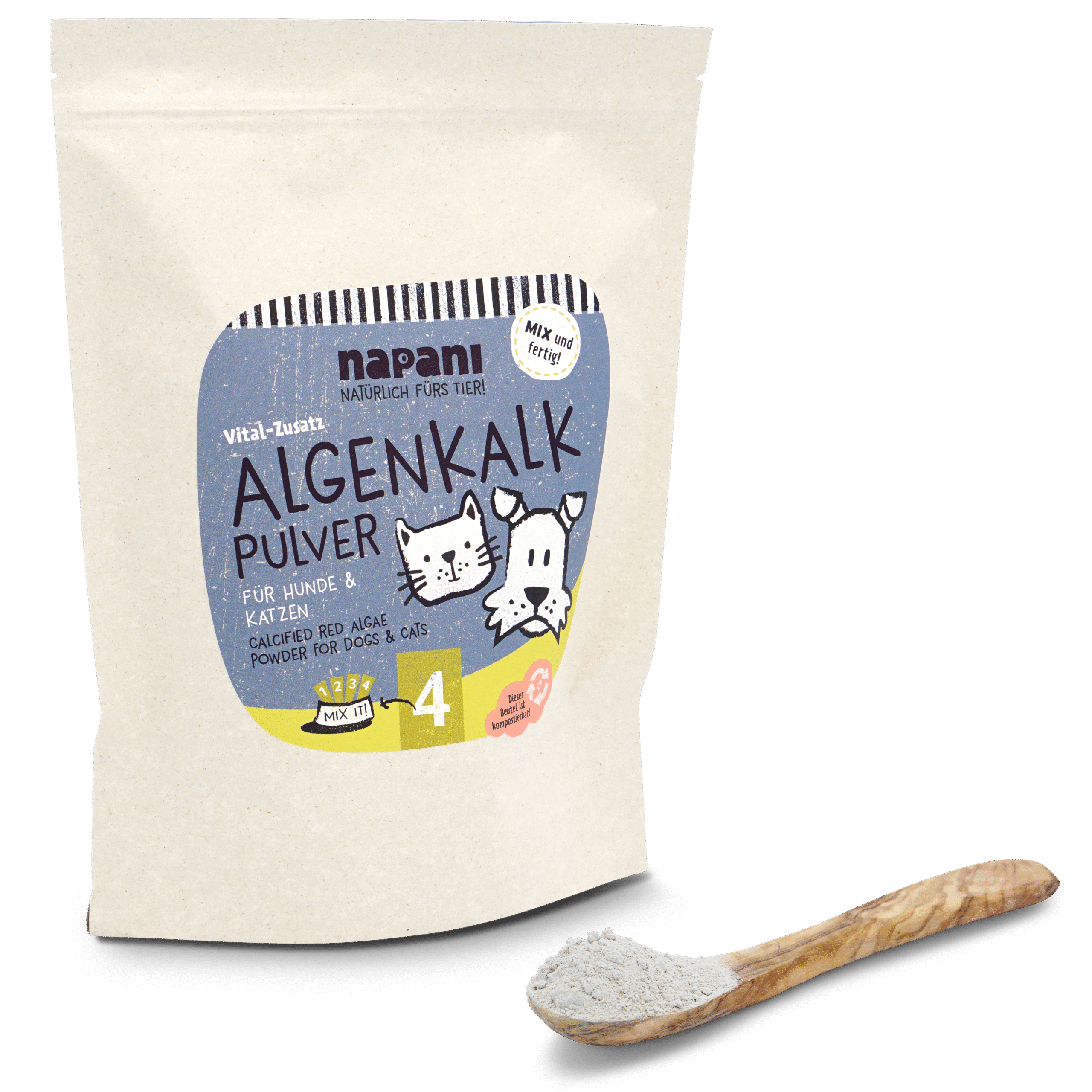 Unser napani Algenkalk wird aus mineralisierten, sedimentierten Ablagerungen der Rotalgen (Lithothamnium calcareum) gewonnen. Als langsam, in ihrer natürlichen Umgebung am Meeresgrund, gedeihende Pflanze beinhaltet sie eine Vielzahl für den Körper unverzichtbare Vitamine und Mineralstoffe (wie Calcium, Magnesium und Eisen), ausserdem organisch gebundene Spurelemente (wie Selen und Kupfer) sowie gesundheitsfördernde, bioaktive sekundäre Pflanzenstoffe. Die im Wasser intensiv roter Farbe der Alge wird beim trocknen weiss. Zu feinem Pulver gemahlen, dienen die Rotalgen als hochwertige Calciumquelle für Hunde und Katzen und versorgen deshalb auch Hunde, die keine Knochen vertragen (Verdauungsprobleme) oder keine Knochen gefüttert bekommen, mit natürlichem Calcium. Algenkalk, bzw. der hohe Calcium Anteil gleicht auch den Phosphorüberschuss durch zu viel Fleischanteil im Napf (Fleischdose, reine Fleichfütterung, Rohfütterung / BARF) aus.