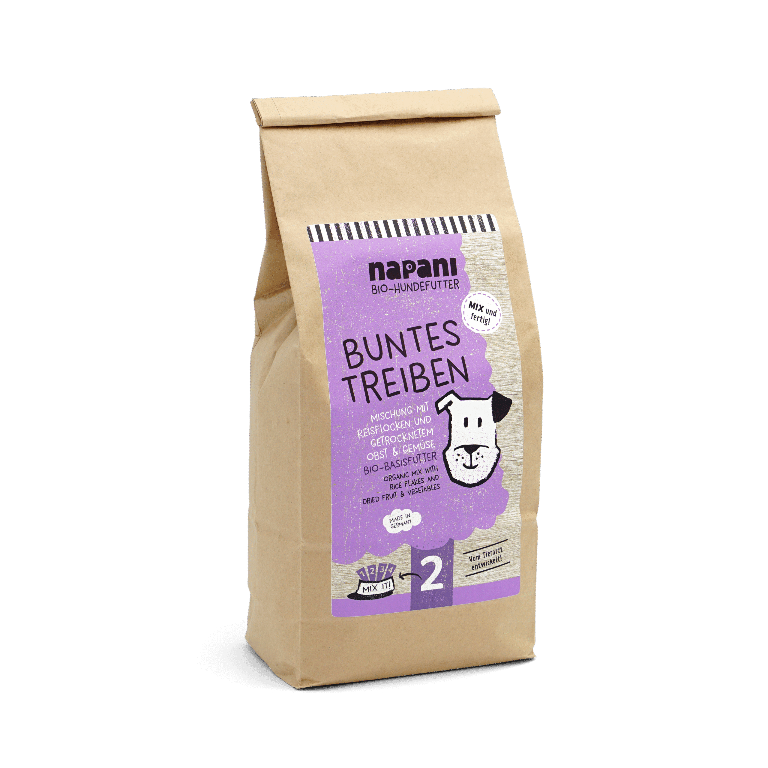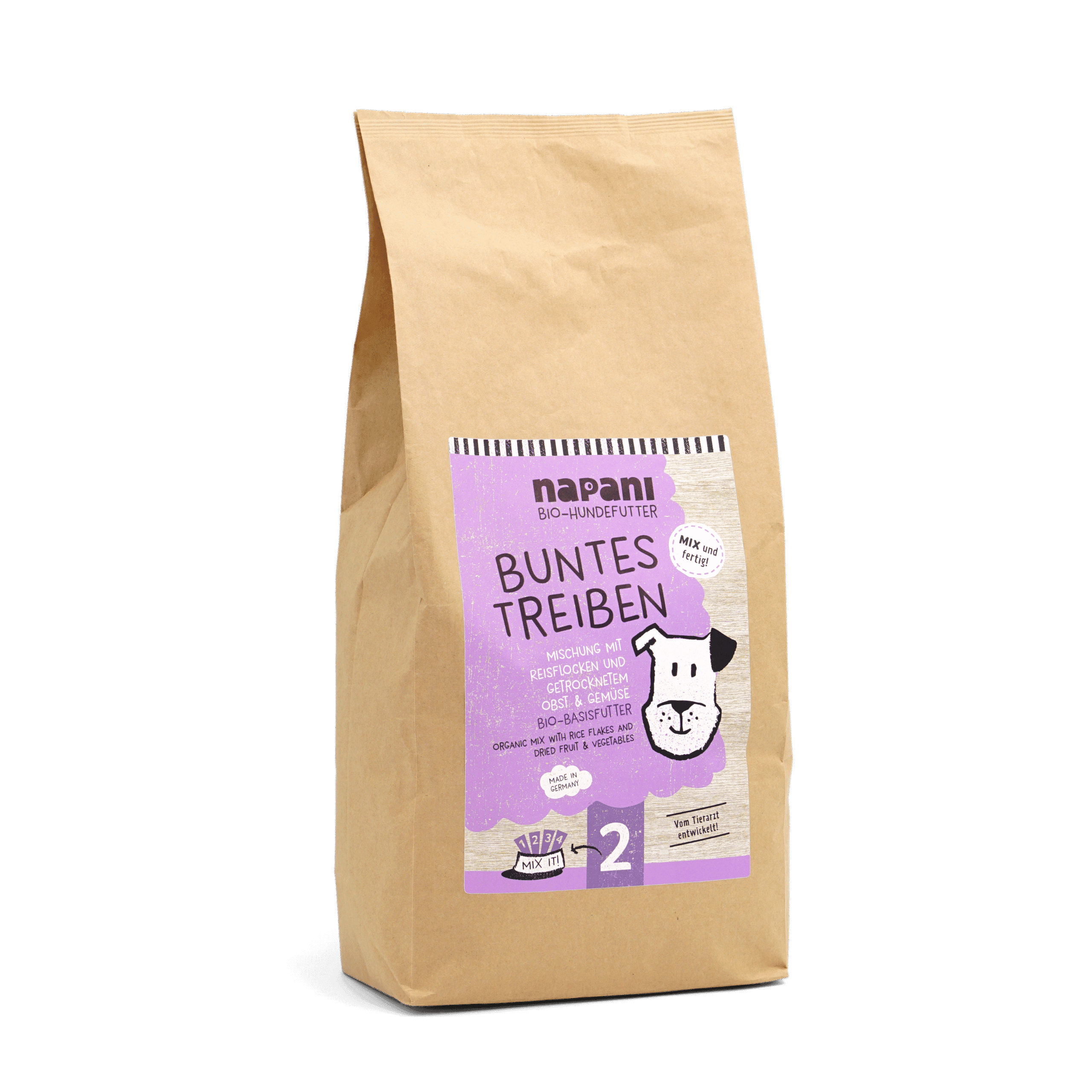 Unser Bio-Mischung «Buntes Treiben» ist eine ausgewogene und gesunde Basis, die sorgfältig aus hochwertigen, biologischen Zutaten zusammengestellt wurde. Dieses Müsli bietet eine hervorragende Möglichkeit, die Ernährung Ihres Hundes zu ergänzen und ihm alle notwendigen Nährstoffe zu liefern. Es lässt sich mit anderen Zutaten zu einer leckeren, hochwertigen Mahlzeit kombinieren. Ganz einfach und schnell – auch perfekt für unterwegs! Die Komposition aus Kohlenhydraten und Ballaststoffen ist eine optimale Ergänzung zu unseren Produkten (wie z.B. Bio Rind pur), eignet sich aber auch als Beilage zu einer vollwertigen Rohfleisch Fütterung (BARF).