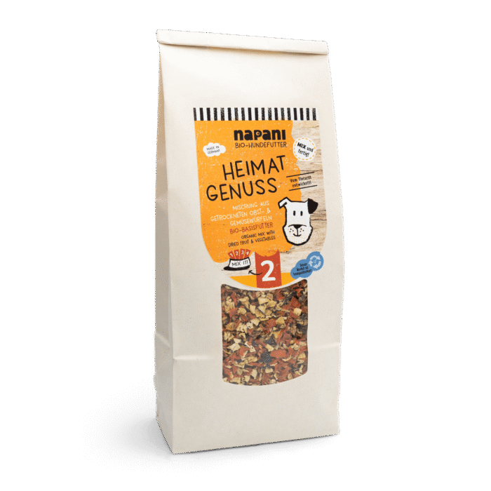 Unsere Bio Obst- und Gemüse Mischung «Heimat Genuss» ist eine gesunde Beilage zum ausgewogenen Hundemenü. Sie lässt sich mit anderen Zutaten zu einer leckeren, hochwertigen Mahlzeit kombinieren. Ganz einfach und schnell – auch perfekt für unterwegs! Die Komposition aus Vitaminen und Ballaststoffen ist eine optimale Ergänzung zu unseren Produkten (wie z.B. Bio Rind pur und Bio Fit Flakes), eignet sich aber auch als Beilage zu einer vollwertigen Rohfleisch Fütterung (BARF).