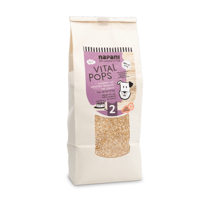 Unser Bio Basisfutter «Vital Pops» ist eine gesunde Beilage zum ausgewogenen Hundemenü. Die Mischung besteht aus gepufftem Amaranth und Quinoa und ist sehr gut verdaulich. Für mehr Abwechslung im Napf – eine ideal abgestimmte, vollwertige Mahlzeit für Ihren Liebling. Unsere Vital Pops eignen sich aber auch als Beilage zu einer vollwertigen Rohfleisch Fütterung (BARF).