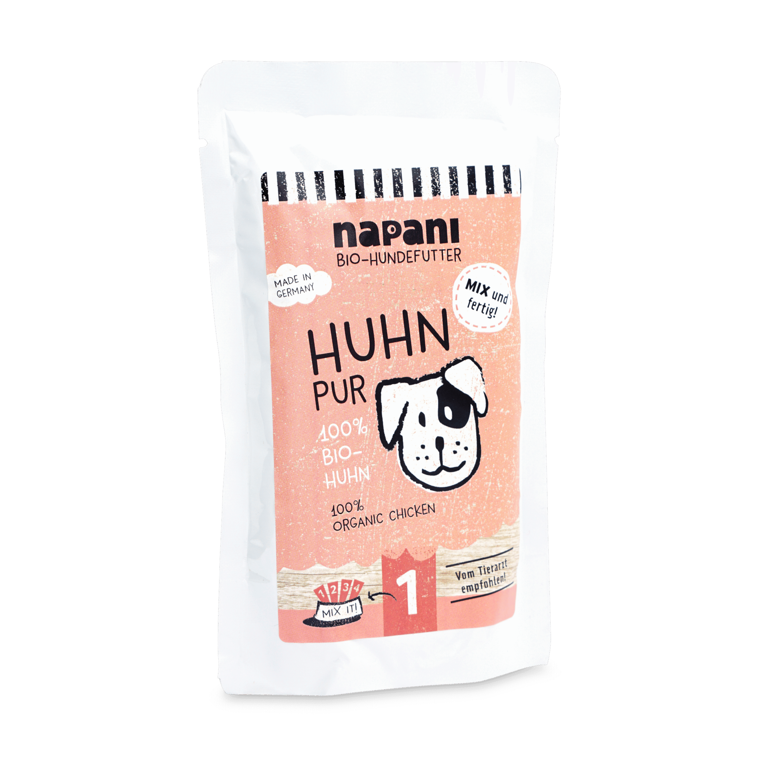 100 % Hühnerfleisch – natürlich in Bio-Qualität. Wir von napani achten auch für uns selbst bei der Ernährung auf gute Qualität, da ist es für uns selbstverständlich, dass unsere Tiere, zum Wohle ihrer Gesundheit auch nur das Beste in den Napf bekommen. Ganz nach dem Motto: «dein Hund ist, was er frisst». Bei uns gibt es nur jeweils eine Fleischquelle in der Dose – und die wird schonend dampfgegart. So bleiben möglichst viele Vitamine und Mineralstoffe des Fleisches erhalten. Um ein artgerechtes, bedarfsdeckendes Futter zu erhalten mische unser Basisfutter, Vital-Zusätze und Vital-Öle unter. Mischen ist possible!
