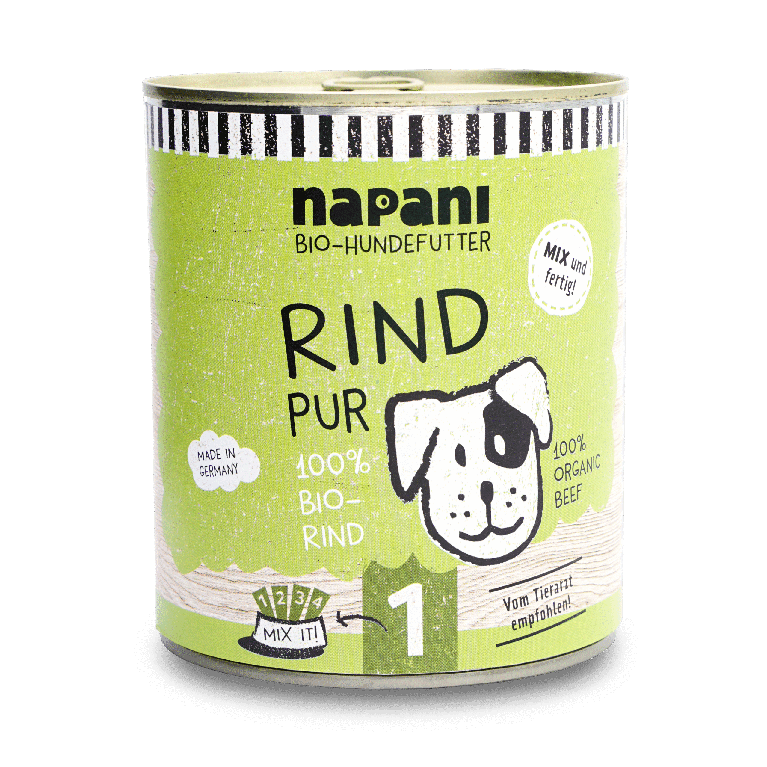 100% Rindfleisch – natürlich in Bioqualität. Wir von napani achten auch für uns selbst bei der Ernährung auf gute Qualität, da ist es für uns selbstverständlich, dass unsere Tiere, zum Wohle ihrer Gesundheit auch nur das Beste in den Napf bekommen. Ganz nach dem Motto: «dein Hund ist, was er frisst». Bei uns gibt es nur jeweils eine Fleischquelle in der Dose – und die wird schonend dampfgegart. So bleiben möglichst viele Vitamine und Mineralstoffe des Fleisches erhalten. Um ein artgerechtes, bedarfsdeckendes Futter zu erhalten mische unser Basisfutter, Vital-Zusätze und Vital-Öle unter. Mischen ist possible!