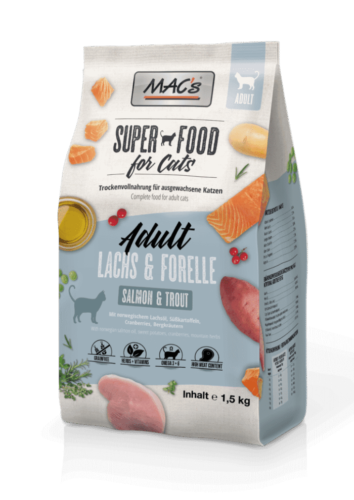 MAC’s Adult Lachs & Forelle bietet Ihrer Katze eine leckere Fischkomposition. Lachs, Forelle und norwegisches Lachsöl sind reich an Omega-Fettsäuren und sorgen für eine gesunde Haut und ein glänzendes Fell. Cranberries sind natürliche Säurebildner und können bakteriellen Blaseninfektionen vorbeugen.