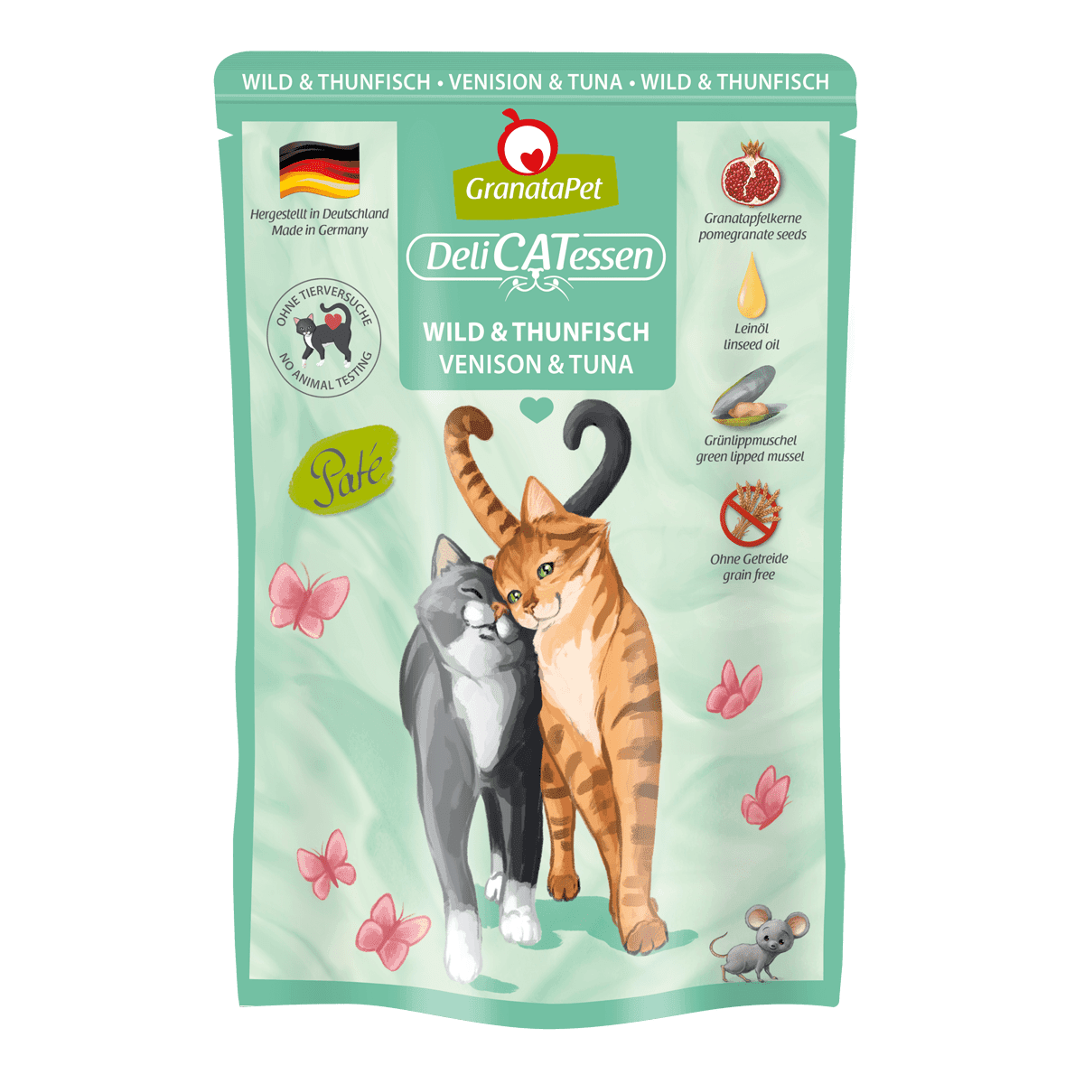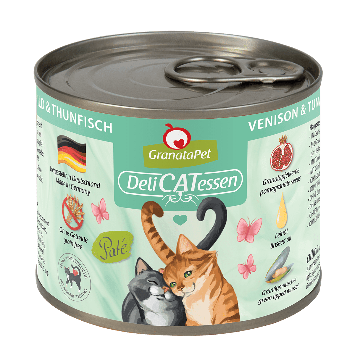 Mit unserem Nassfutter DeliCatessen Wild & Thunfisch versorgst Du deine Samtpfote nicht nur lecker, sondern auch artgerecht mit allem, was eine gesunde Katze braucht. Das proteinreiche und gut verdauliche Alleinfutter wird bei Produktion schonend dampfgegart, sodass alle wertvollen Nährstoffe erhalten bleiben. Dazu ist unser DeliCatessen Menü reich an hochwertigen Ölen und unterstützt dank neuseeländischer Grünlippmuschel die Gelenke. Unser namensgebender Granatapfel darf natürlich auch hier nicht fehlen und rundet die bedarfsdeckende Nassnahrung als Unterstützung des Immunsystems ab.