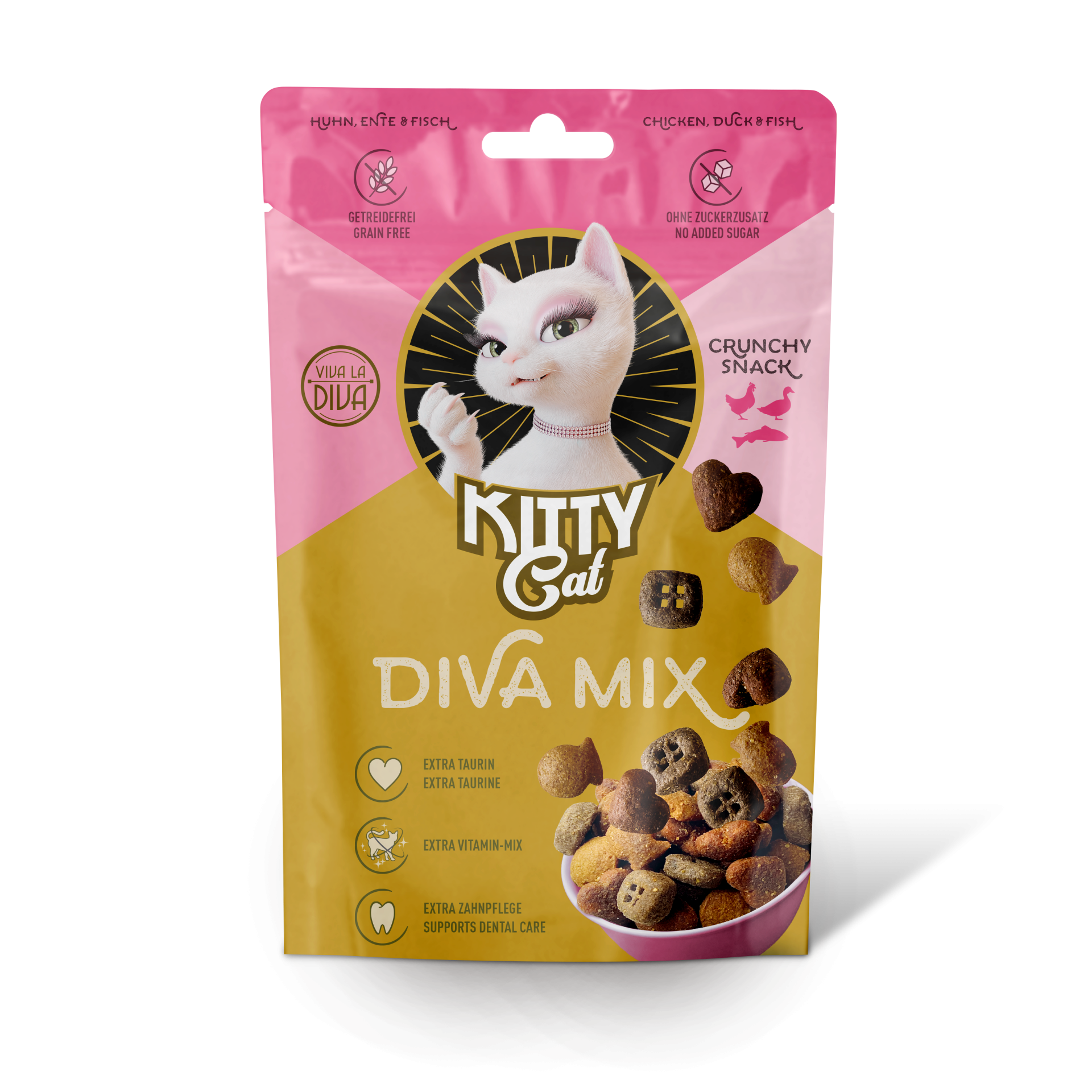 Eintönigkeit darf bei einer waschechten Diva auf keinen Fall aufkommen, besonders nicht, wenn es um heiss geliebte Snacks geht. Deshalb gibt es von mir meinen Diva Mix, der keine Wünsche offen und keine Eintönigkeit aufkommen lässt. Mit den drei leckeren Geschmackssorten Huhn, Ente und Fisch findet deine Samtpfote garantiert zu jeder Gelegenheit den richtigen Snack, der noch dazu getreide- und zuckerfrei ist.