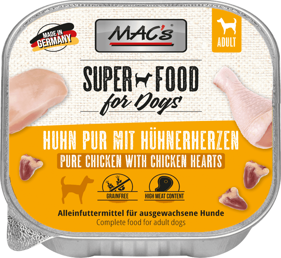Mit MAC´s bekommt Ihr Hund das, was er am liebsten mag – Fleisch. Orientiert an der natürlichen Ernährung und durch den konsequenten Verzicht auf künstliche Zutaten sorgt MAC´s für eine gesunde und ausgewogene Ernährung in Harmonie mit den natürlichen Bedürfnissen Ihres Hundes.