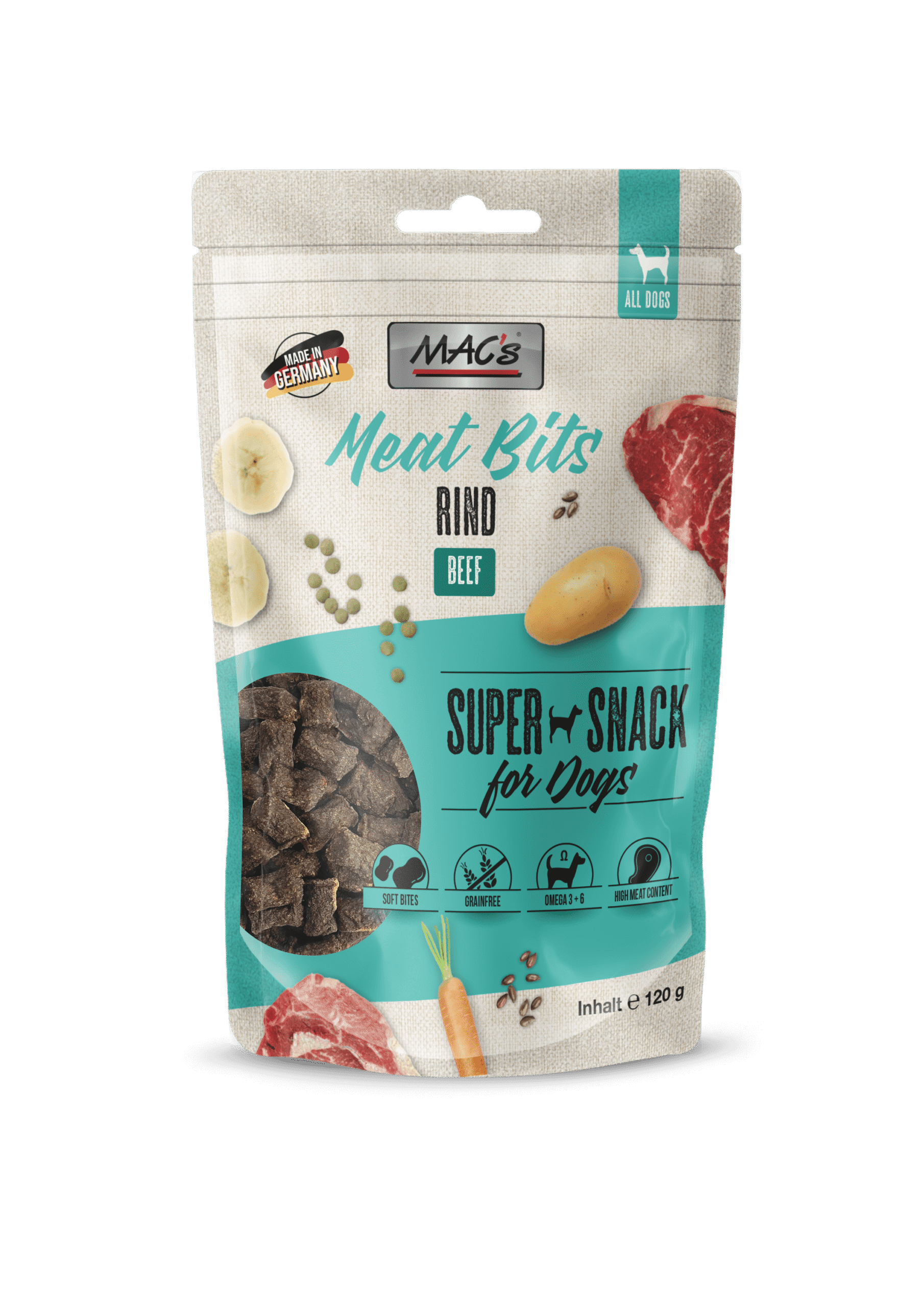 MACs MEAT BITS Rind sind besonders schmackhaft und mit viel frischem Fleisch zubereitet. Der hohe Fleischanteil und die getreidefreie Rezeptur, in Kombination mit Obst und Gemüse, sorgen ausserdem für einen bekömmlichen Leckerbissen!