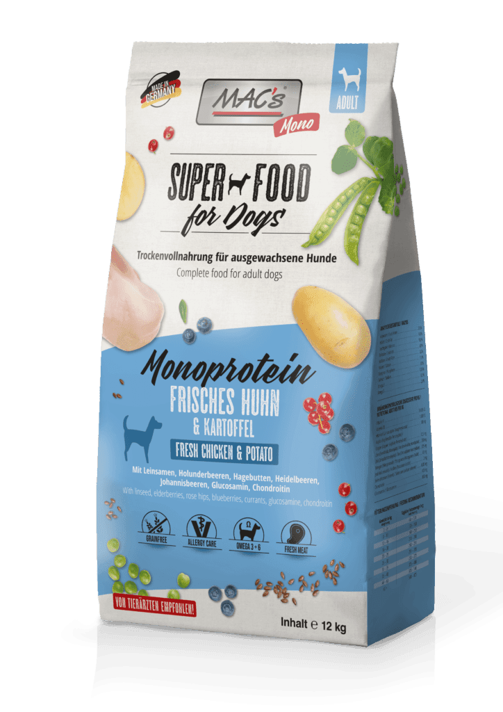 MAC’s MONO wurde speziell für allergieanfällige Hunde entwickelt. Die Grundlage ist eine Fleischsorte als Proteinlieferant und Kartoffel und Erbsen als Kohlenhydratquelle.