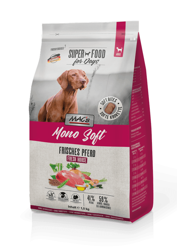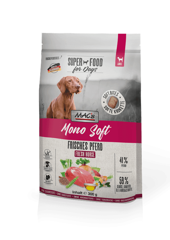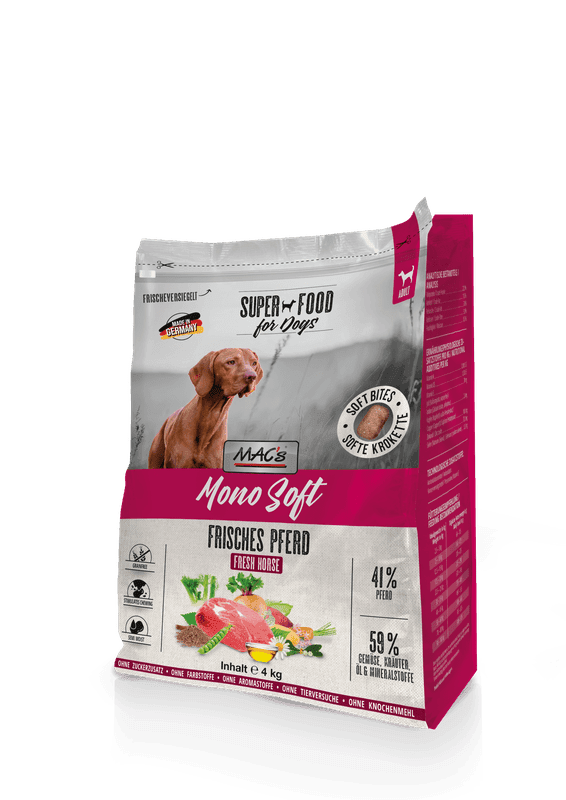 Soft, Mono und perfekt für empfindliche Hunde: Das neue MAC’s Soft Mono Pferd liefert deiner Fellnase viel frisches Fleisch, kombiniert mit frischem Gemüse und gesunden Kräutern. Das halbfeuchte Futter ist ideal für Hunde, die sich zwischen Trocken- und Nassfutter nicht so recht entscheiden möchten. Die softe Beschaffenheit, der hohe Feuchtigkeitsgehalt und das vitaminschonende Kochverfahren sorgen für eine besonders hohe Akzeptanz. Durch den hohen Anteil an frischem Pferdefleisch als einzige tierische Proteinquelle eignet sich MAC’s Soft Mono Pferd ideal zur Ausschlussdiät sowie für allergieanfällige und ernährungssensible Hunde. Die Sorte ist ausserdem getreidefrei und enthält Süsskartoffeln, welche die Verdauung zusätzlich fördern.