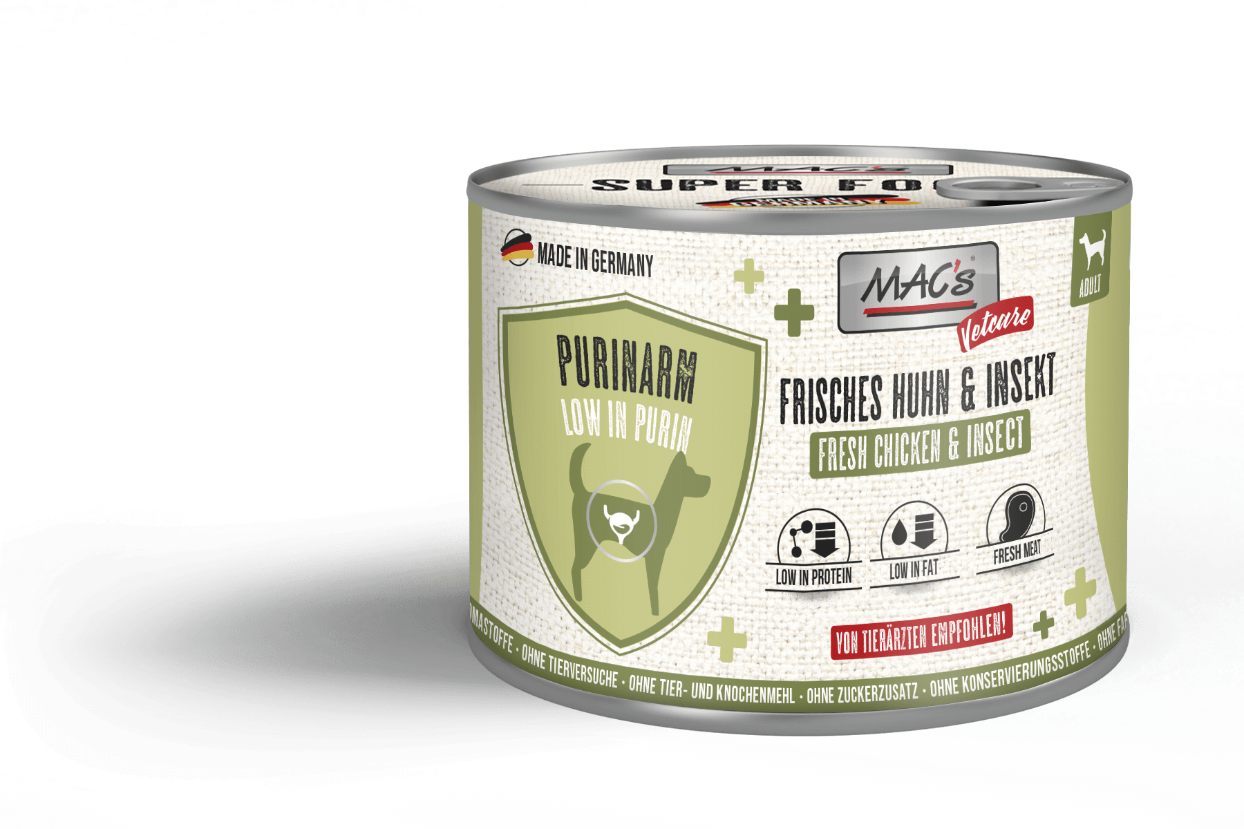 MAC’s Purinarm kann die Verdauung und Muskelentwicklung bei geringem Purinanteil unterstützen. Das magere und frische Hühnchen sowie die Soldatenfliegenlarve weisen einen niedrigen Purin- und Proteingehalt auf. Zudem wird auf übermässige Füll- und Zusatzstoffe verzichtet, um den Puringehalt niedrig zu halten und eine qualitativ hochwertige Nahrung zu bieten.