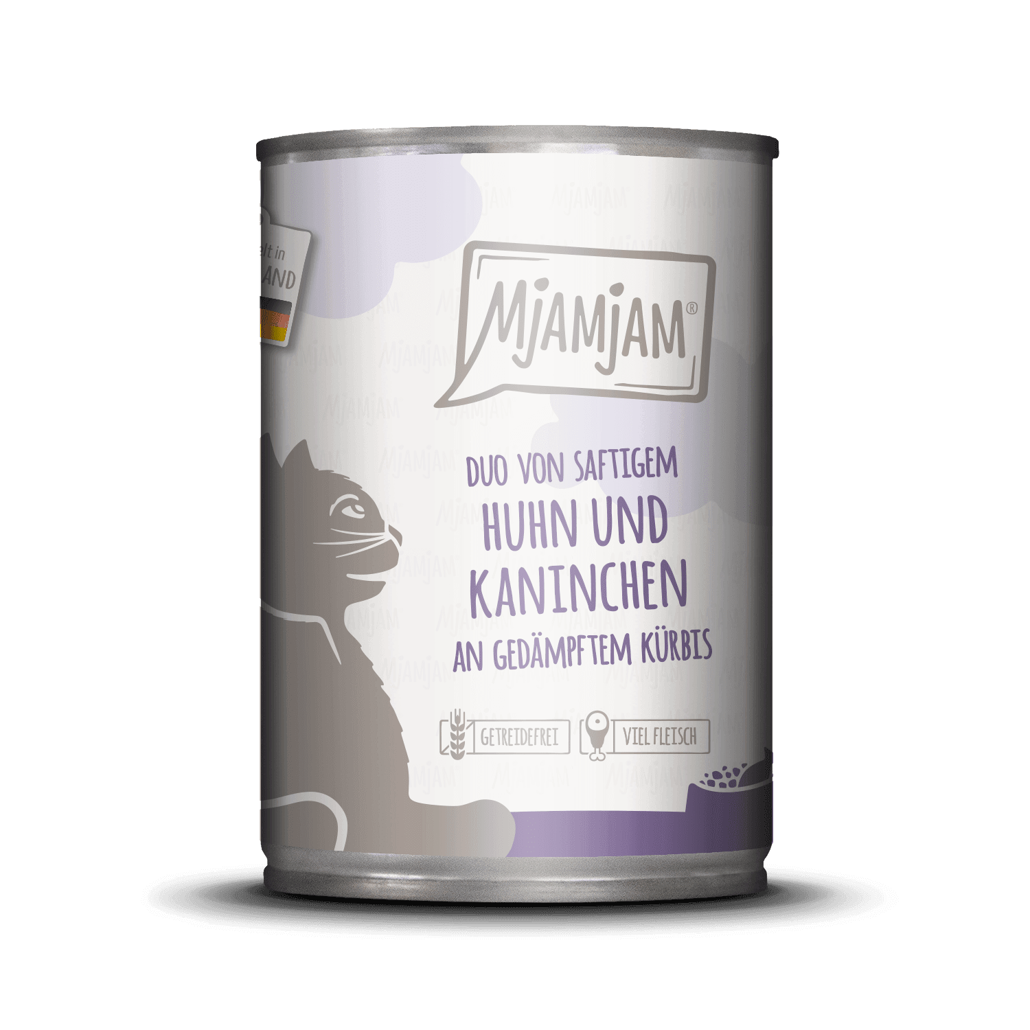 Zweimal mehr Geschmack, zweimal mehr „Food-Fun“, zweimal mehr MjAMjAM – egal ob „Paula“ oder „Bruno“, alle lieben MjAMjAM-DUO! Wer den vollen Geschmack gleich doppelt erleben möchte, sollte schnellstens zu unseren leckeren DUO-Sorten greifen. Saftiges Hühnchen & Kaninchen an gedämpftem Kürbis sorgen zusammen für eine Mahlzeit ganz nach dem Geschmack Deines Lieblings. Dazu packen wir auch noch einen extra hohen Fleischanteil in unsere Sorten und verzichten auf künstliche Zusätze. Klingt „pawtastisch“? Dann ab in den Warenkorb damit!