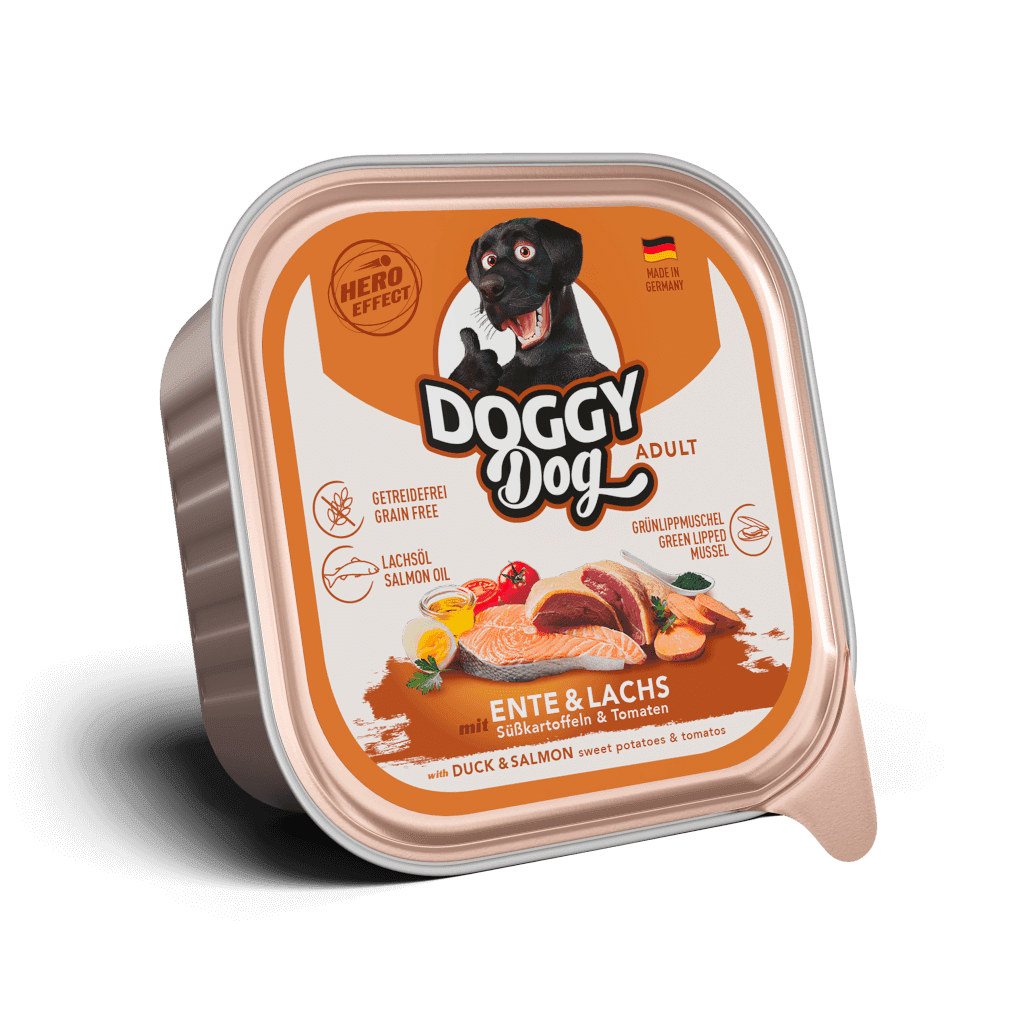 Gönne deinem Buddy was und verwöhne ihn mit DOGGY Dog’s schmackhafter Ente & Lachs mit Süsskartoffeln & Tomaten Komposition.