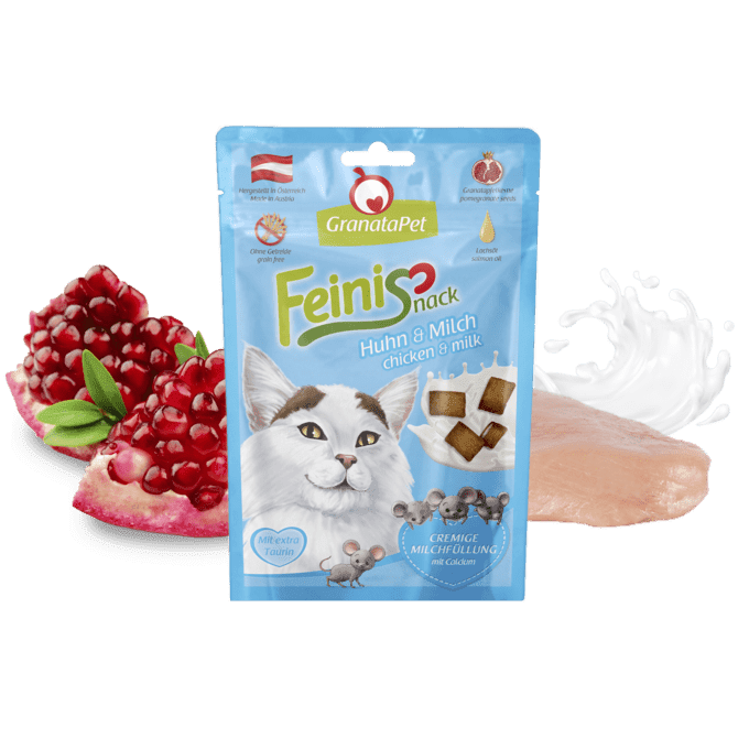 GranataPet Feinis Huhn & Milch sind mit ihrer wohl einzigartigen Komposition der ideale Snack für zwischendurch. Getreidefrei mit feinstem Hühnerfleisch, Lachsöl, Granatapfelkernen und Milch erobern unsere Feinis alle Katzenherzen.