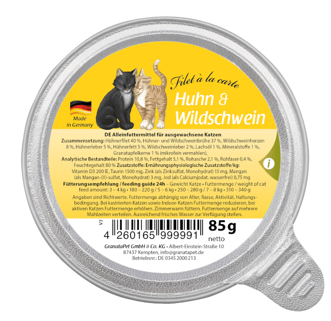 GranataPet Filet à la carte besteht aus zarten und schmackhaften Filetstückchen im eigenen Saft sowie weiteren wertvollen Zutaten. Schonend in der eigenen Brühe gegart ist dieses erstklassige naturbelassene Nassfutter besonders schmackhaft und bekömmlich. Das Lachsöl schützt die Haut Ihrer Katze und bewirkt bei ihr ein seidiges, glänzendes Fell. Natürlich enthält es auch ausreichend Taurin für Ihren Schmusetiger.