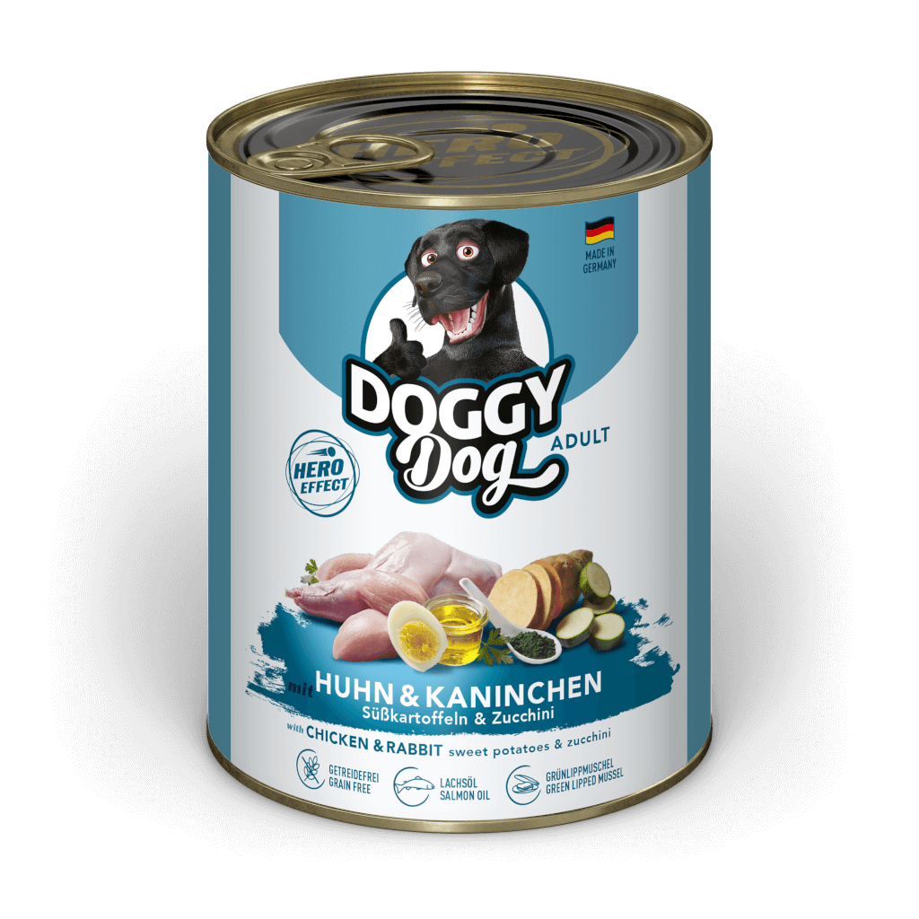 DOGGY Dog’s Huhn & Kaninchen mit Süsskartoffeln & Zucchini Mahlzeit versorgt deinen Hund mit allem, was ein echter Hero braucht.