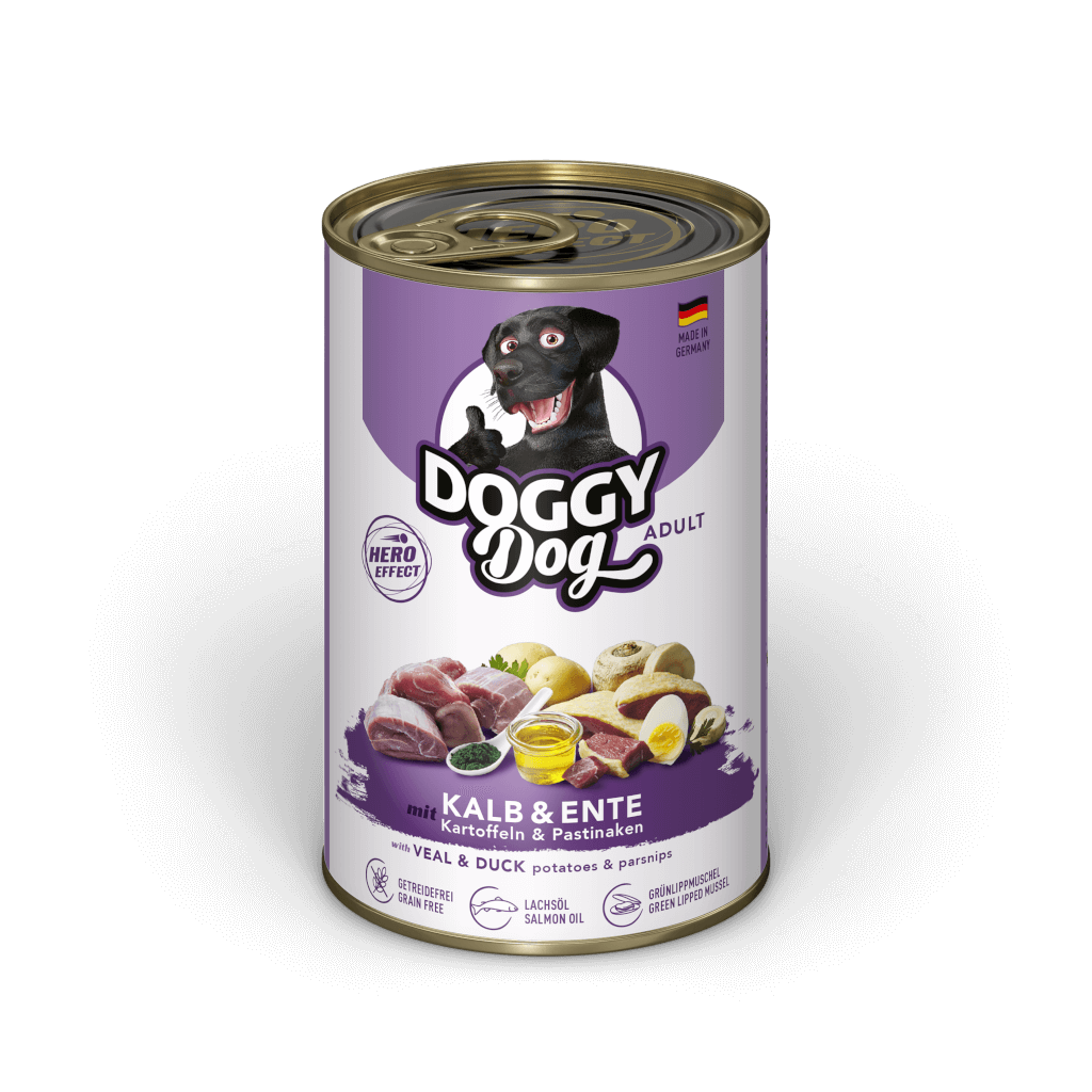 DOGGY Dog‘s Rezeptur Kalb & Ente mit Kartoffeln & Pastinaken bietet deinem vierbeinigen Hero das volle Energiepaket. Hochwertiges Kalbfleisch versorgt deinen Liebling mit viel Protein, wertvollem Eisen und Zink.