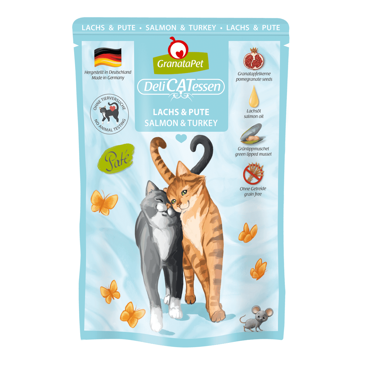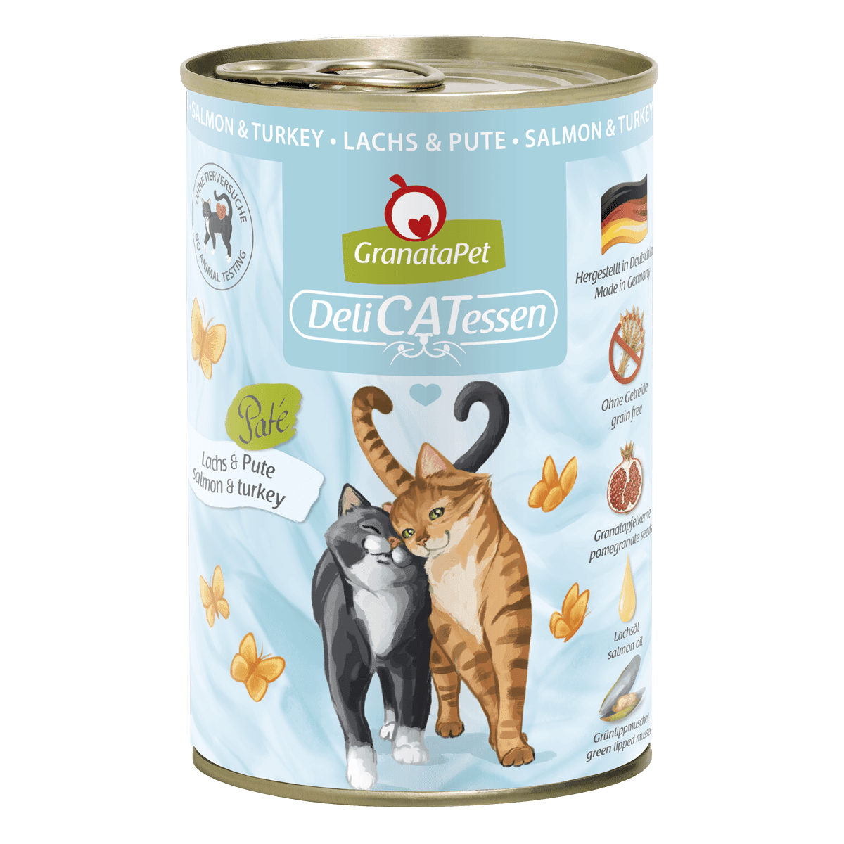 Mit unserem Nassfutter DeliCatessen Lachs & Pute versorgst Du deine Samtpfote nicht nur lecker, sondern auch artgerecht mit allem, was eine gesunde Katze braucht. Das proteinreiche und gut verdauliche Alleinfutter wird bei Produktion schonend dampfgegart, sodass alle wertvollen Nährstoffe erhalten bleiben. Dazu ist unser DeliCatessen Menü reich an hochwertigen Ölen und unterstützt dank neuseeländischer Grünlippmuschel die Gelenke. Unser namensgebender Granatapfel darf natürlich auch hier nicht fehlen und rundet die bedarfsdeckende Nassnahrung als Unterstützung des Immunsystems ab.