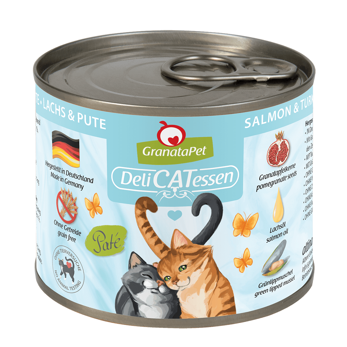GranataPet Nassfutter DeliCATessen bietet feinstes Paté in 13 verschiedenen, ideal ausbalancierten Varianten. Die Kaltabfüllung der Rohstoffe und die anschliessend schonende Dampfgarung sorgen dafür, dass wertvolle Nährstoffe, Vitamine und essentielle Fettsäuren der Zutaten erhalten bleiben. Die Nassfutter-Menüs sind reich an hochwertigen Ölen (Lachsöl oder Leinöl) und enthalten die Neuseeländische Grünlippmuschel zum Schutz von Knochen und Gelenken sowie Granatapfelkerne zur Unterstützung des Immunsystems.