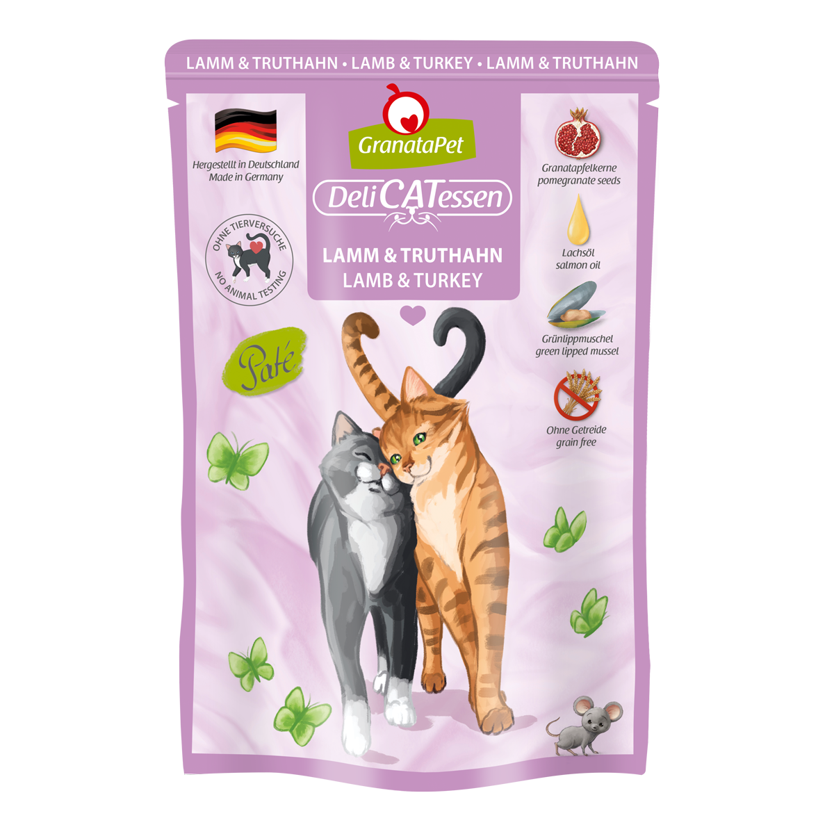 Mit unserem Nassfutter DeliCatessen Lamm & Truthahn versorgst Du deine Samtpfote nicht nur lecker, sondern auch artgerecht mit allem, was eine gesunde Katze braucht. Das proteinreiche und gut verdauliche Alleinfutter wird bei Produktion schonend dampfgegart, sodass alle wertvollen Nährstoffe erhalten bleiben. Dazu ist unser DeliCatessen Menü reich an hochwertigen Ölen und unterstützt dank neuseeländischer Grünlippmuschel die Gelenke. Unser namensgebender Granatapfel darf natürlich auch hier nicht fehlen und rundet die bedarfsdeckende Nassnahrung als Unterstützung des Immunsystems ab.