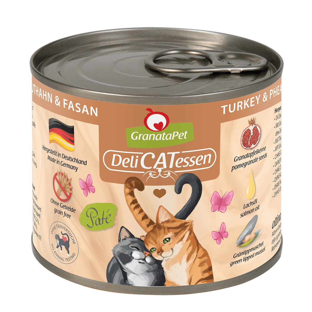 GranataPet Nassfutter DeliCATessen bietet feinstes Paté in 13 verschiedenen, ideal ausbalancierten Varianten. Die Kaltabfüllung der Rohstoffe und die anschliessend schonende Dampfgarung sorgen dafür, dass wertvolle Nährstoffe, Vitamine und essentielle Fettsäuren der Zutaten erhalten bleiben. Die Nassfutter-Menüs sind reich an hochwertigen Ölen (Lachsöl oder Leinöl) und enthalten die Neuseeländische Grünlippmuschel zum Schutz von Knochen und Gelenken sowie Granatapfelkerne zur Unterstützung des Immunsystems.