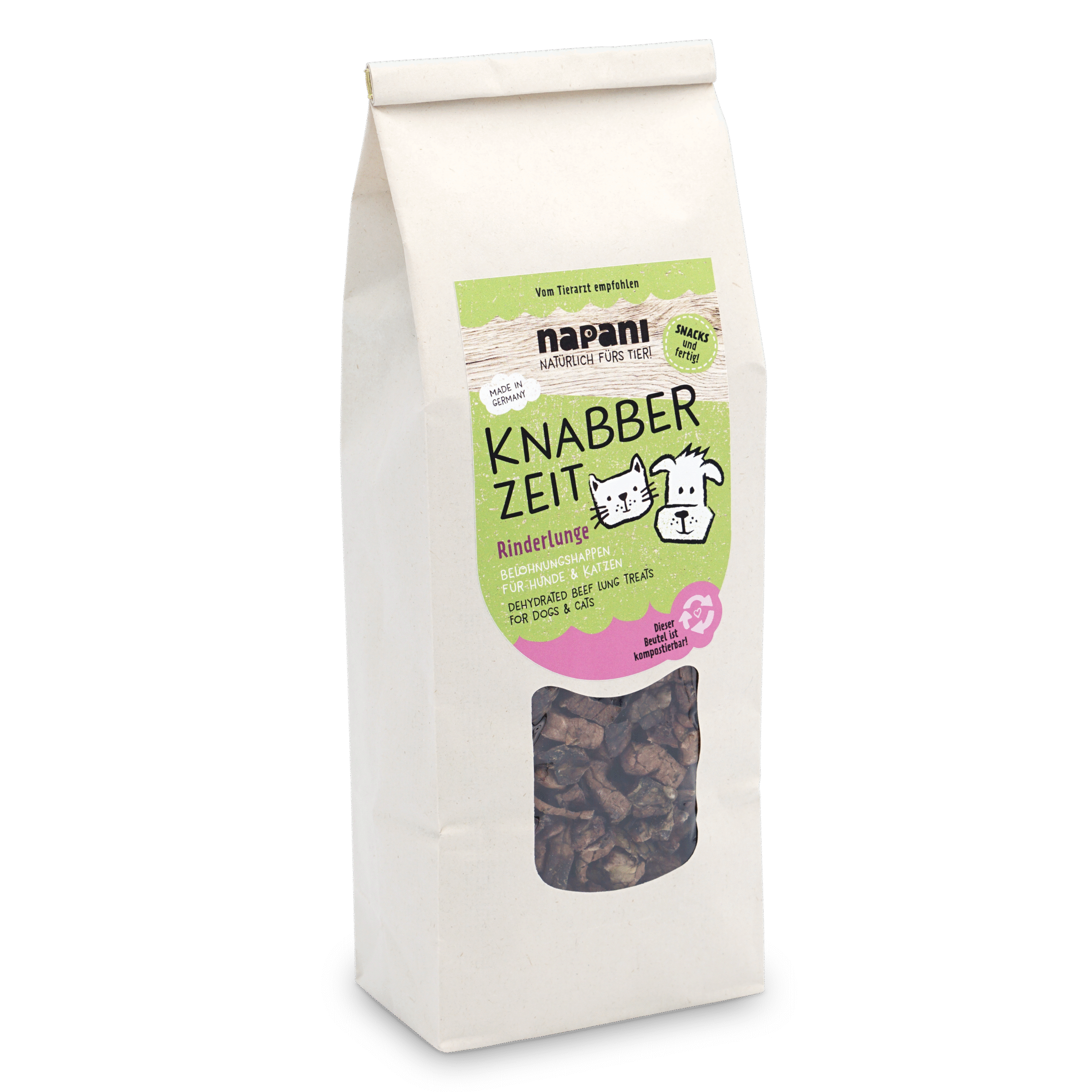 Unsere luftgetrocknete Rinderlunge ist ein leichter, magerer Snack für Zwischendurch. Weil sie seht kalorienarm ist, eignet sie sich auch perfekt zum Training. Aber auch Katzen lieben diese Knabberei. Nur aus ausgewählten Zutaten und ohne jegliche Zusätze schonend getrocknet.
