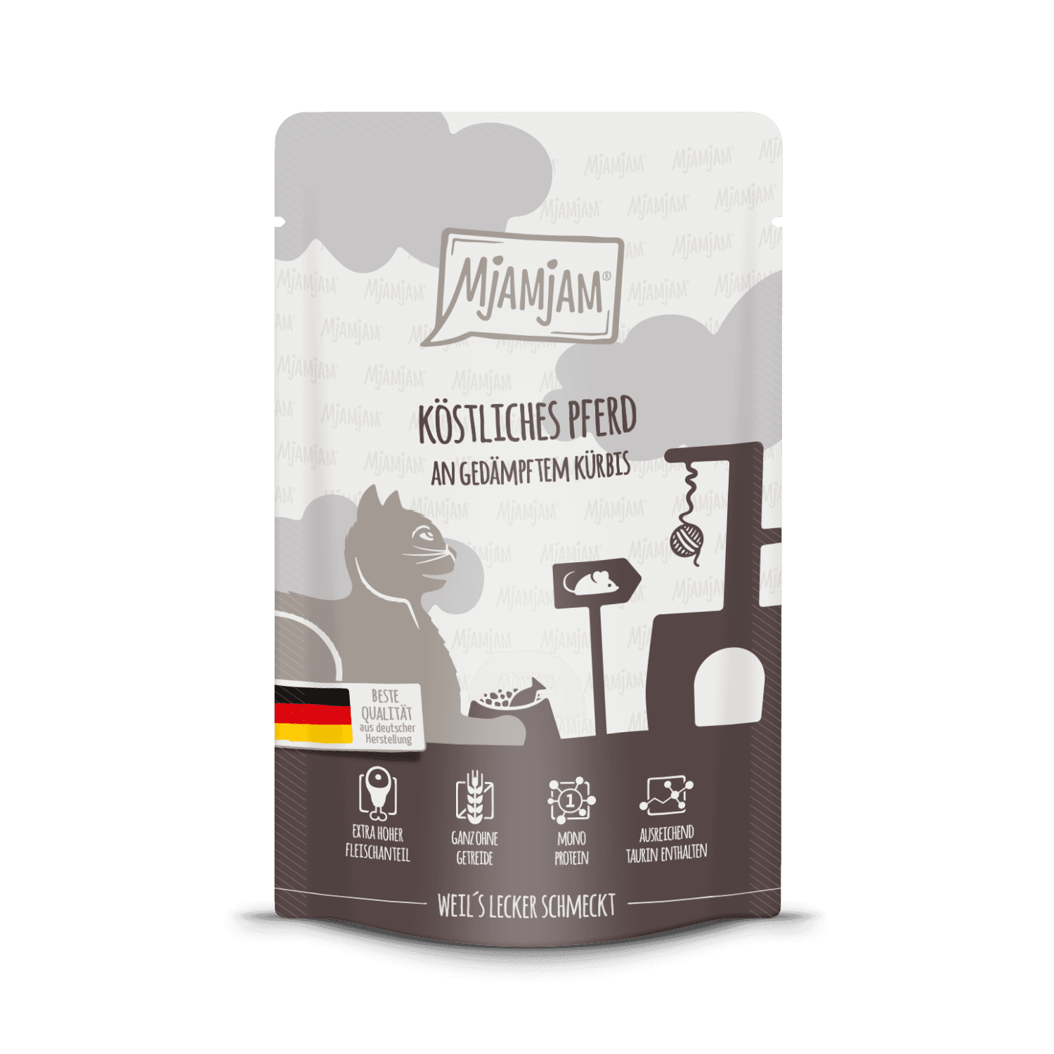 Diese Mahlzeit bietet deinem Liebling alles was er braucht. Das frische Pferdefleisch, verfeinert mit gesundem Kürbis, gibt ihm ein einzigartiges und exklusives Genusserlebnis, das ihn zugleich mit allen wichtigen Vitaminen und Mineralien versorgt. „Artgerecht, natur- und beutenah“ – dies steht bei uns für einen sehr hohen Fleischanteil. Auf Getreide, Zucker, Konservierungs- oder Geschmacksstoffe sowie synthetische Bindemittel wird vollends verzichtet.““MjAMjAM – Köstliches Pferd an gedämpftem Kürbis