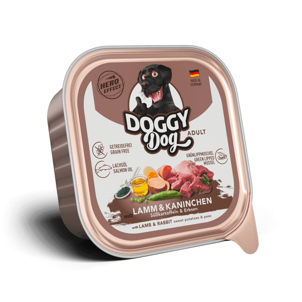 Lammfromm oder aufgeweckt wie ein Kaninchen? DOGGY Dog’s Geschmacksrichtung Lamm & Kaninchen mit Süsskartoffeln & Erbsen ist auf jeden Fall für Vierbeiner mit beiden Charakterzügen bestens geeignet.