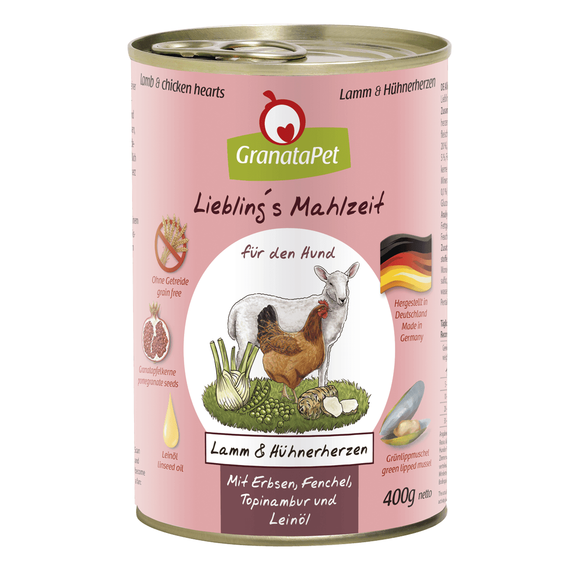 Mit viel frischem Lamm und Hühnerherzen (65%). Dazu leckere Gartenerbsen, verdauungsfördernder Fenchel, gesunder Topinambur, Granatapfelkerne sowie hochwertiges Leinöl runden diese Mahlzeit ab.