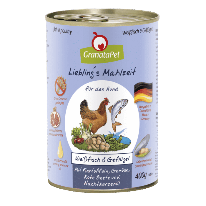 Weissfisch und Geflügelfleisch 65 % (Weissfisch 20 % und Geflügel 45 % bestehend aus Muskelfleisch, Herz, Leber), Fisch- und Geflügelbrühe 21,4 %, Kartoffel 5 %, Rote Beete 3 %, Mangold 1 %, Zucchini 1 %, Fenchel 1 %, Granatapfelkerne 1 % (getrocknet und fein vermahlen), Mineralstoffe 1 %, Nachtkerzenöl 0,5 %, Grünlippmuschel 0,1 % (fein vermahlen, von Natur aus reich an Glucosamin und Chondroitin)