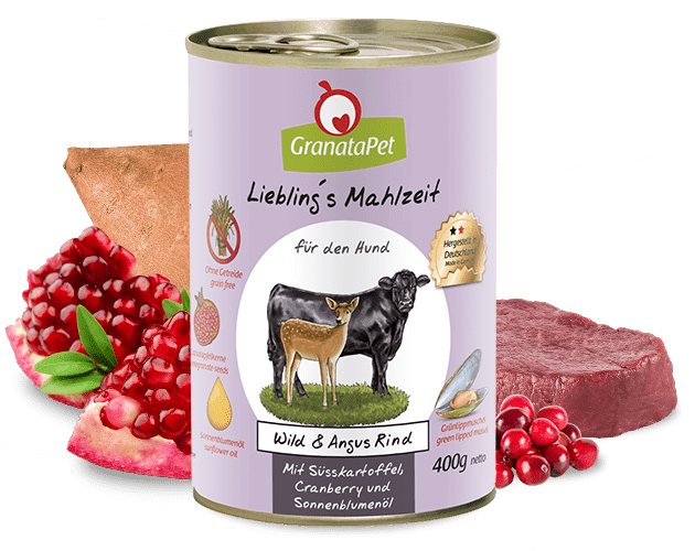 GranataPet Liebling´s Mahlzeit ist aufgrund seiner fleischigen, feinen Komposition die ideale, ausbalancierte Vollwertnahrung – nur einmalig schonend dampfgegart. Durch die gezielte Zugabe von Süsskartoffel, Cranberry und Sonnenblumenöl wird dieses Hundefutter bewusst verfeinert und schafft es ausschliesslich mit gesunden und leckeren Zutaten jedes Hundeherz zu erobern.
