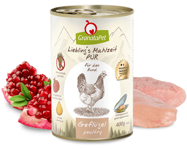 GranataPet Liebling´s Mahlzeit Geflügel Pur ist eine klassische, zarte Fleischdose (single animal protein) ohne Getreide für wahre Fleischliebhaber. Die enthaltenen Granatapfelkerne sollen dem Zellschutz dienen und zur Stärkung des Immunsystems beitragen. Zusätzlich enthält diese Mahlzeit Lachsöl mit wertvollen Fettsäuren und die Grünlippmuschel, welche von Natur aus reich an den gelenkaktiven Zutaten Glucosamin und Chondroitin ist.