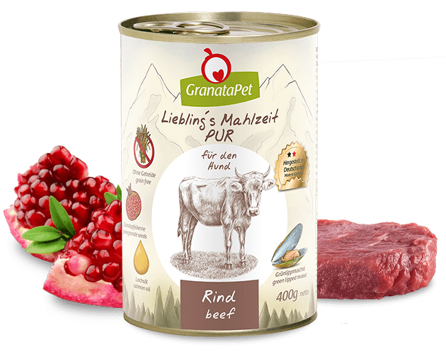 GranataPet Liebling´s Mahlzeit Rind Pur ist eine klassische, herzhafte Fleischdose (single animal protein) ohne Getreide für wahre Fleischliebhaber. Die enthaltenen Granatapfelkerne sollen dem Zellschutz dienen und zur Stärkung des Immunsystems beitragen. Zusätzlich enthält diese Mahlzeit Lachsöl mit wertvollen Fettsäuren und die Grünlippmuschel, welche von Natur aus reich an den gelenkaktiven Zutaten Glucosamin und Chondroitin ist.