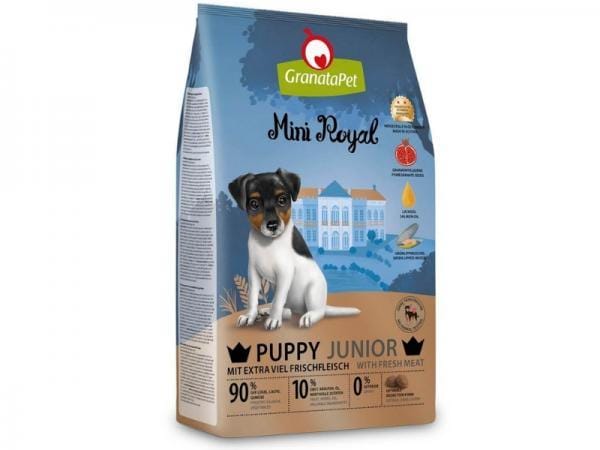 GranataPet Mini Royal Puppy Junior ist eine Vollwertnahrung für Hunde aller kleinen Hunderassen. Das Trockenfutter besteht aus viel frischem und getrocknetem Geflügelfleisch und Lachs sowie Gemüse, Obst, Kräutern, norwegischem Lachsöl und weiteren wertvollen Zutaten.