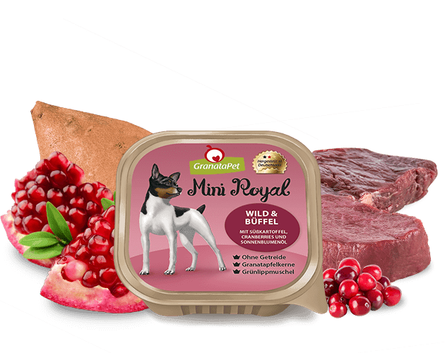 Wild– und Angus-Rindfleisch 65 % (Wild 50 % bestehend aus Muskelfleisch, Herz, Leber, Lunge und Angus Rind 15 % bestehend aus Muskelfleisch, Herz, Leber, Lunge), Wild- und Angus-Rinderbrühe 24,4 %, Süsskartoffel 5 %, Cranberries 3 %, Granatapfelkerne 1 % (getrocknet und fein vermahlen), Mineralstoffe 1 %, Sonnenblumenöl 0,5 %, Grünlippmuschel 0,1 % (fein vermahlen, von Natur aus reich an Glucosamin und Chondroitin)