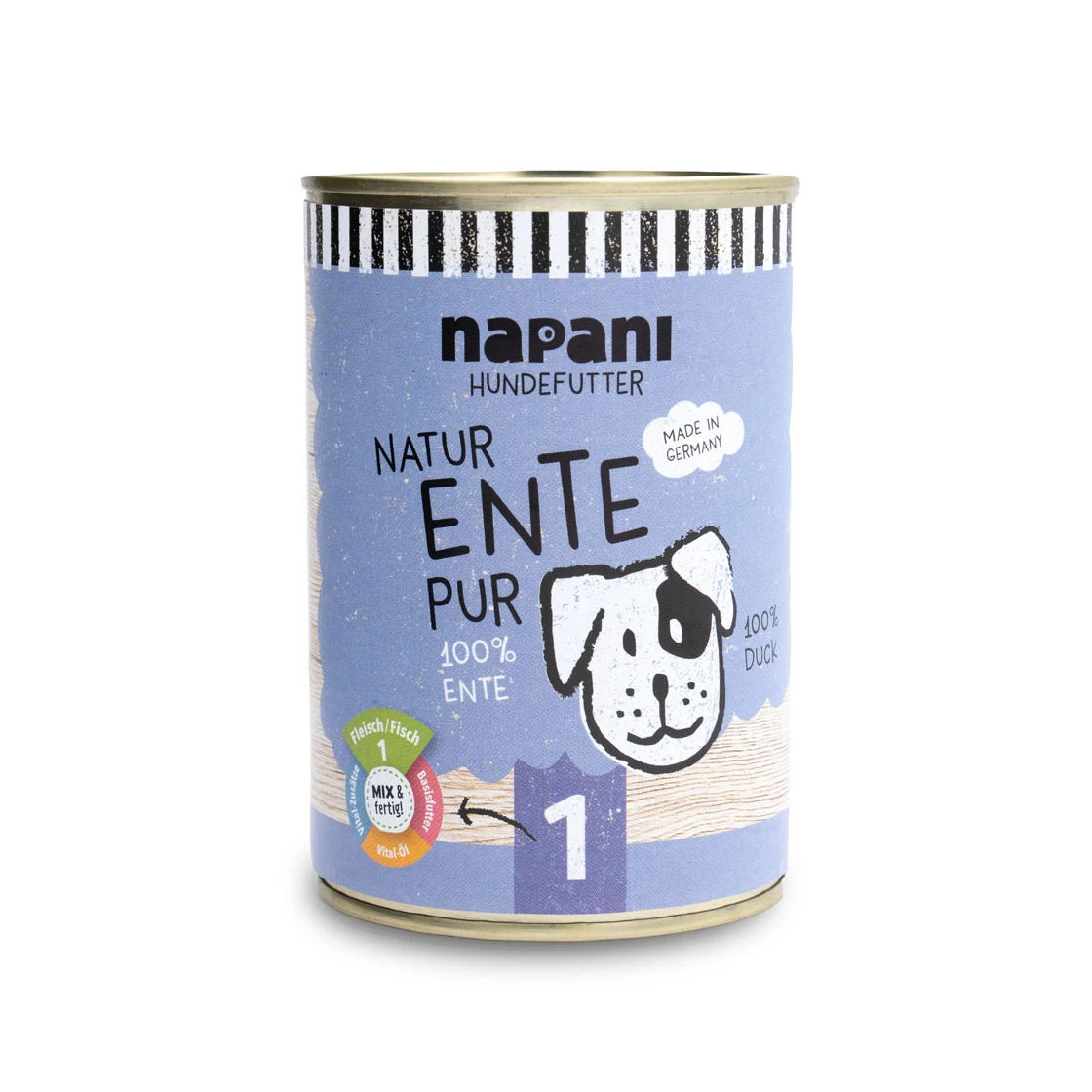 Einfach nur Ente – sonst nichts. Wir von napani achten auch für uns selbst bei der Ernährung auf gute Qualität. Deshalb ist es für uns selbstverständlich und wichtig, dass unsere Vierbeiner zum Wohle ihrer Gesundheit auch nur das Beste in den Napf bekommen. Ganz nach dem Motto: «dein Hund ist, was er frisst». Bei uns gibt es nur jeweils eine Fleischquelle in der Dose – und die wird schonend dampfgegart. So bleiben möglichst viele Vitamine und Mineralstoffe des Fleisches erhalten. Um ein artgerechtes, bedarfsdeckendes Futter zu erhalten mische unser Basisfutter, Vital-Zusätze und Vital-Öle unter. Mischen ist possible!