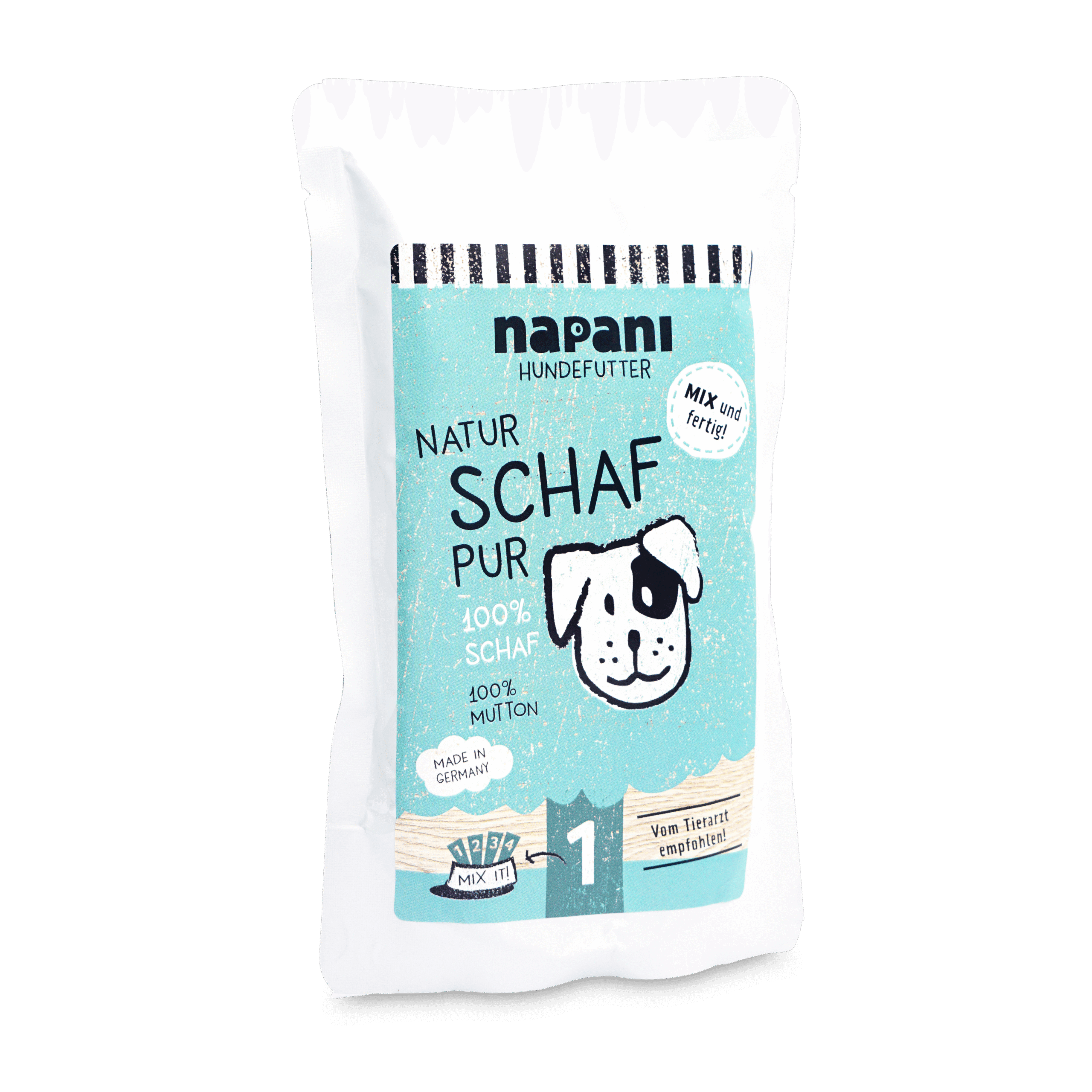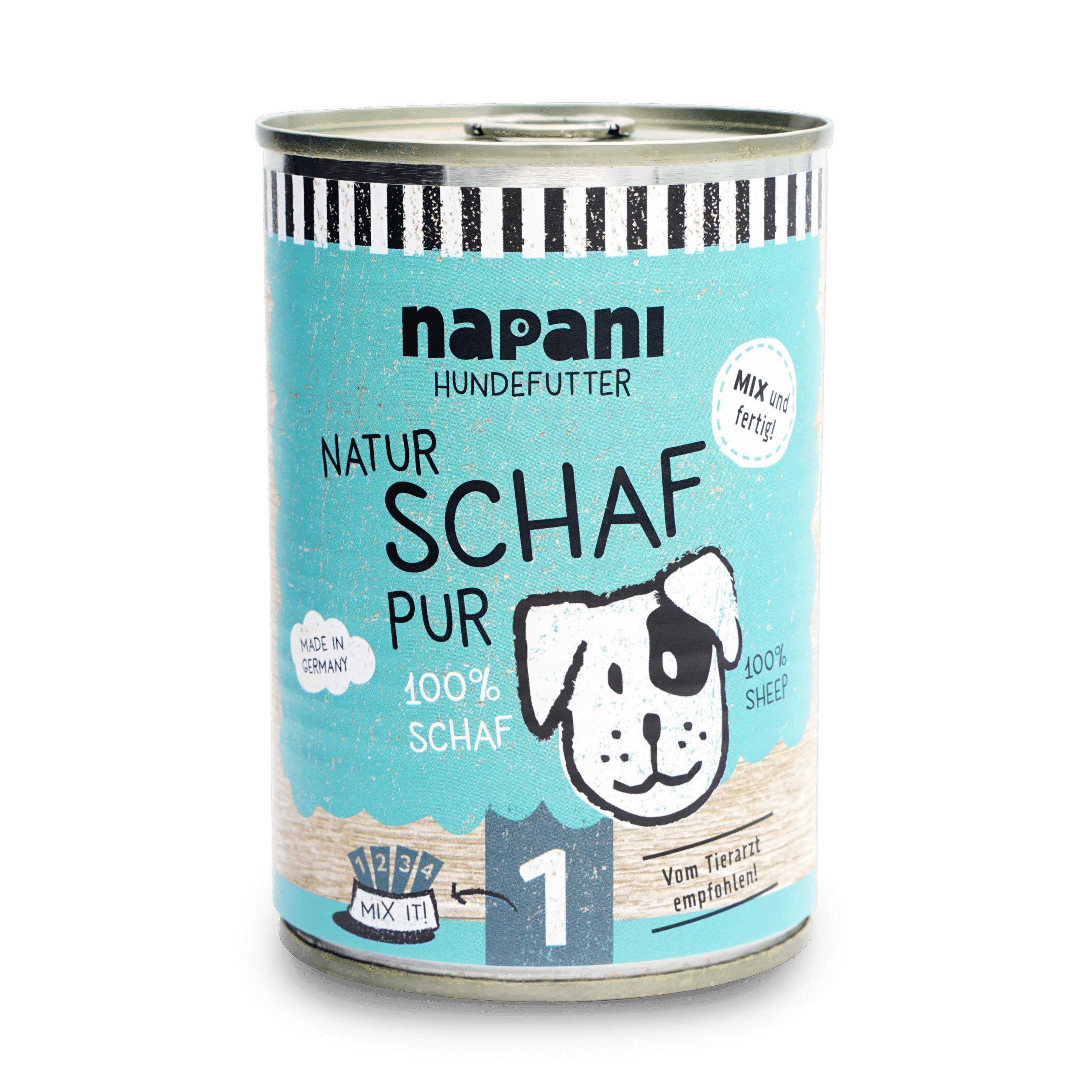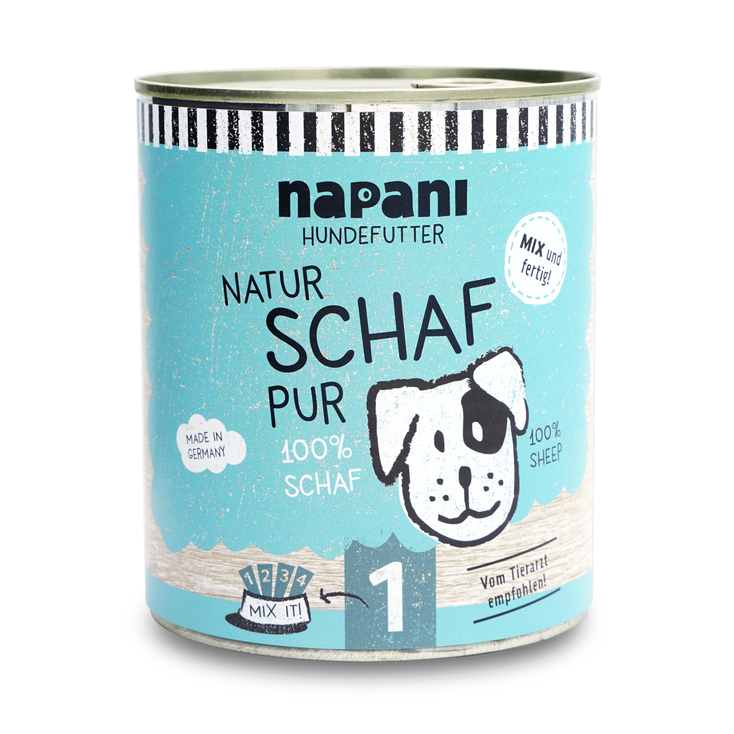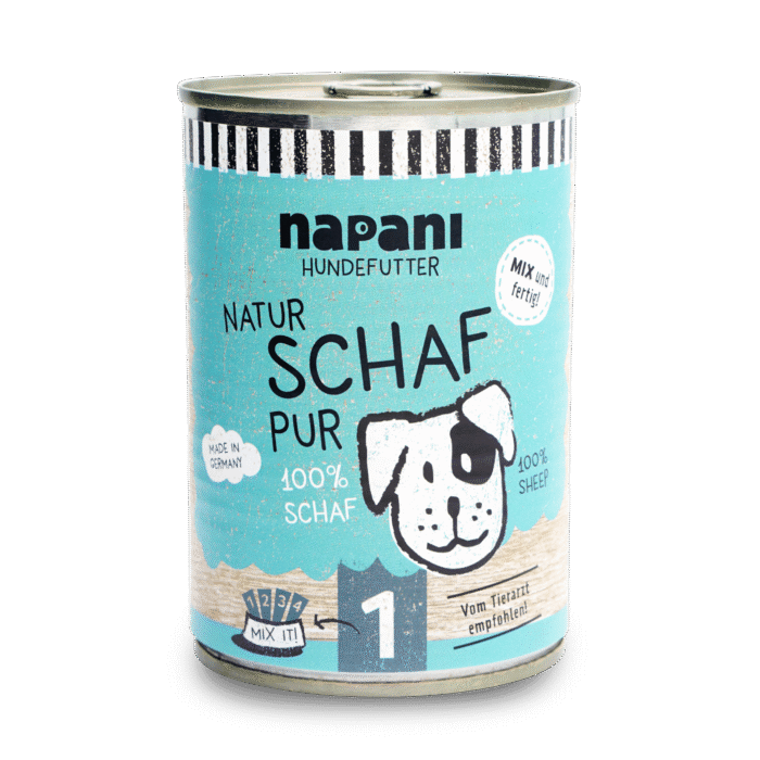 100 % Schaffleisch – sonst nichts! Wir von napani achten auch für uns selbst bei der Ernährung auf gute Qualität, da ist es für uns selbstverständlich, dass unsere Tiere, zum Wohle ihrer Gesundheit auch nur das Beste in den Napf bekommen. Ganz nach dem Motto: «dein Hund ist, was er frisst». Bei uns gibt es nur jeweils eine Fleischquelle in der Dose – und die wird schonend dampfgegart. So bleiben möglichst viele Vitamine und Mineralstoffe des Fleisches erhalten. Um ein artgerechtes, bedarfsdeckendes Futter zu erhalten mische unser Basisfutter, Vital-Zusätze und Vital-Öle unter. Mischen ist possible!