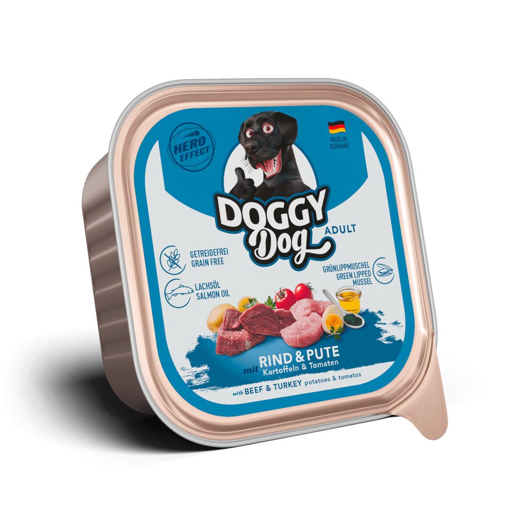 Verwöhne deinen Kumpel mit DOGGY Dog’s Rind & Pute mit Kartoffeln und Tomaten Mahlzeit.