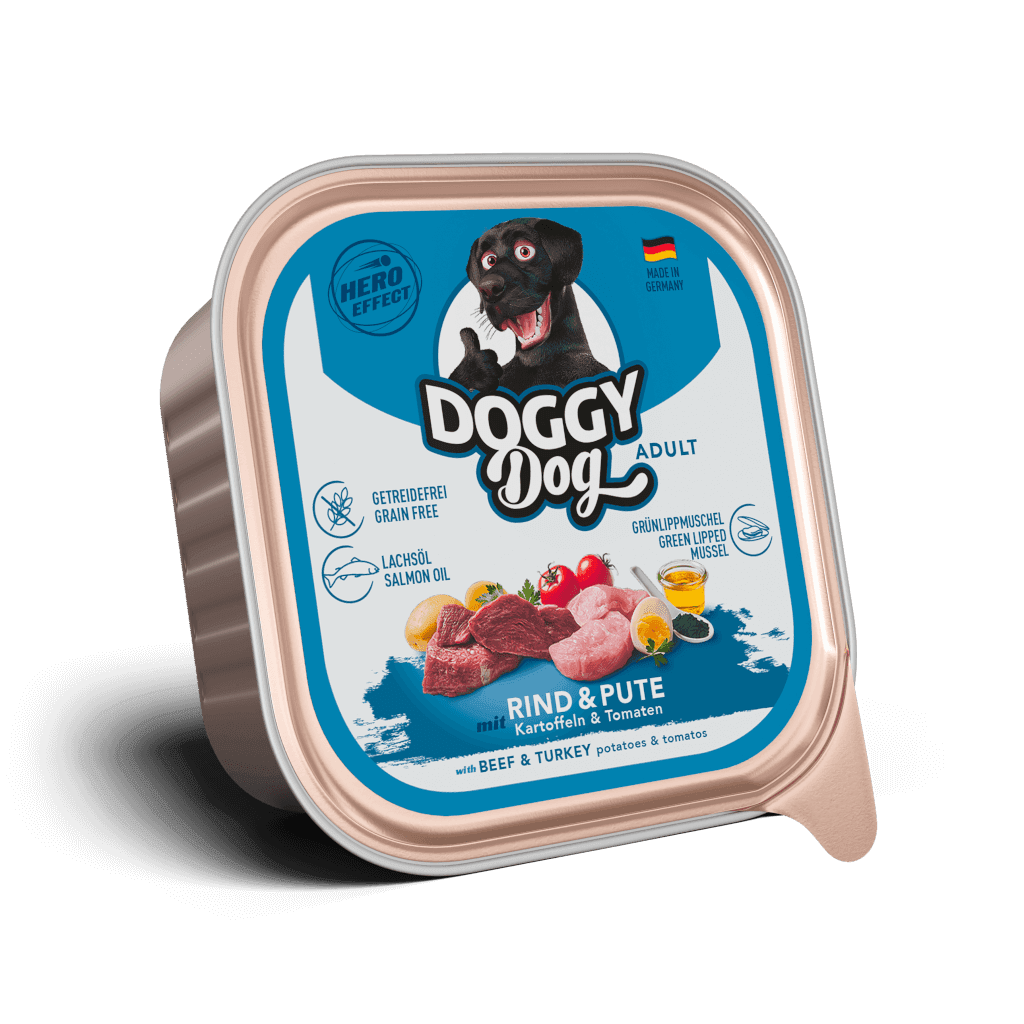 Verwöhne deinen Kumpel mit DOGGY Dog’s Rind & Pute mit Kartoffeln und Tomaten Mahlzeit.