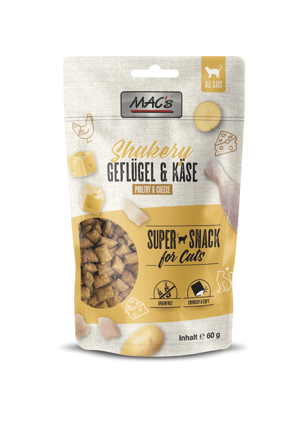 MAC´s Shakerys Geflügel & Käse sind ein schmackhafter Leckerbissen für Ihre Katze. Für das besondere Geschmackserlebnis sorgt die knusprige Hülle mit einer zart-cremigen Geflügel-Käse-Füllung. Zudem enthält der getreidefreie Snack Taurin, welches die Funktion des Herzens Ihres Lieblings unterstützt. Ergänzungsfuttermittel für Katzen.
