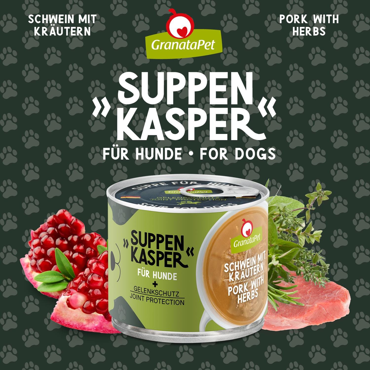 Suppenkasper Schwein mit Kräutern für Hunde – Bei dieser Sorte des neuen GranataPet Suppenkasper für Hunde treffen frische Kräuter auf saftiges Schweinefleisch.