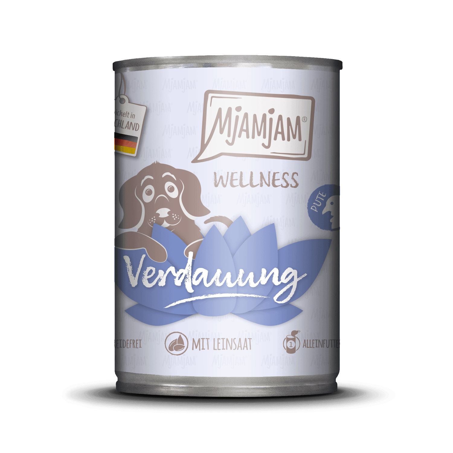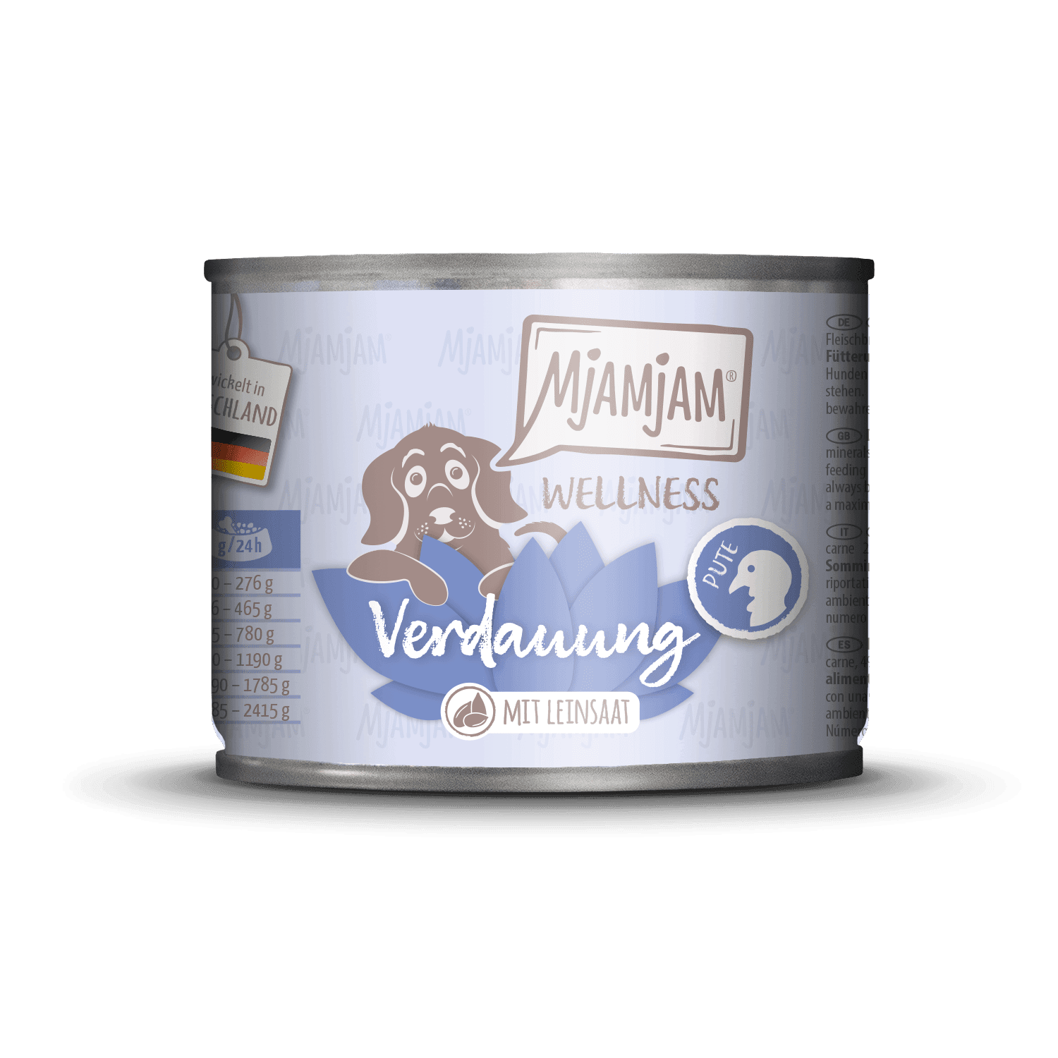 Sanfte Streicheleinheiten für´s Hundebäuchlein garantiert dieses leckere Monoprotein-Alleinfutter. MjAMjAM Wellness Verdauung bringt mit Leinsaat das Verdauungs-Chakra in Balance und den Hundegeist ins Gleichgewicht.