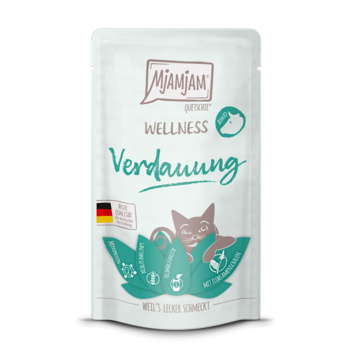 Wenn das „om“ aus der Bauchregion deiner Samtpfote ertönt, scheint die Verdauung aus dem Gleichgewicht geraten zu sein. Um yin und yang in Balance zu halten und sich über derartige Problemchen nicht den Kopf zu zerbrechen, einfach gleich zu MjAMjAM-Wellness greifen! Unsere Auszeit für alle, die dem Verdauungstrakt des Lieblings etwas Gutes tun wollen, kommt jetzt der perfekte Leckerbissen! Leckeres Rindfleisch als Monoprotein und Flohsamenschalen für ein ausgeglichenes Verdauungs-Chakra – mehr Wellness geht nicht. Wohlergehen kommt von Innen – mit MjAMjAM-Wellness!